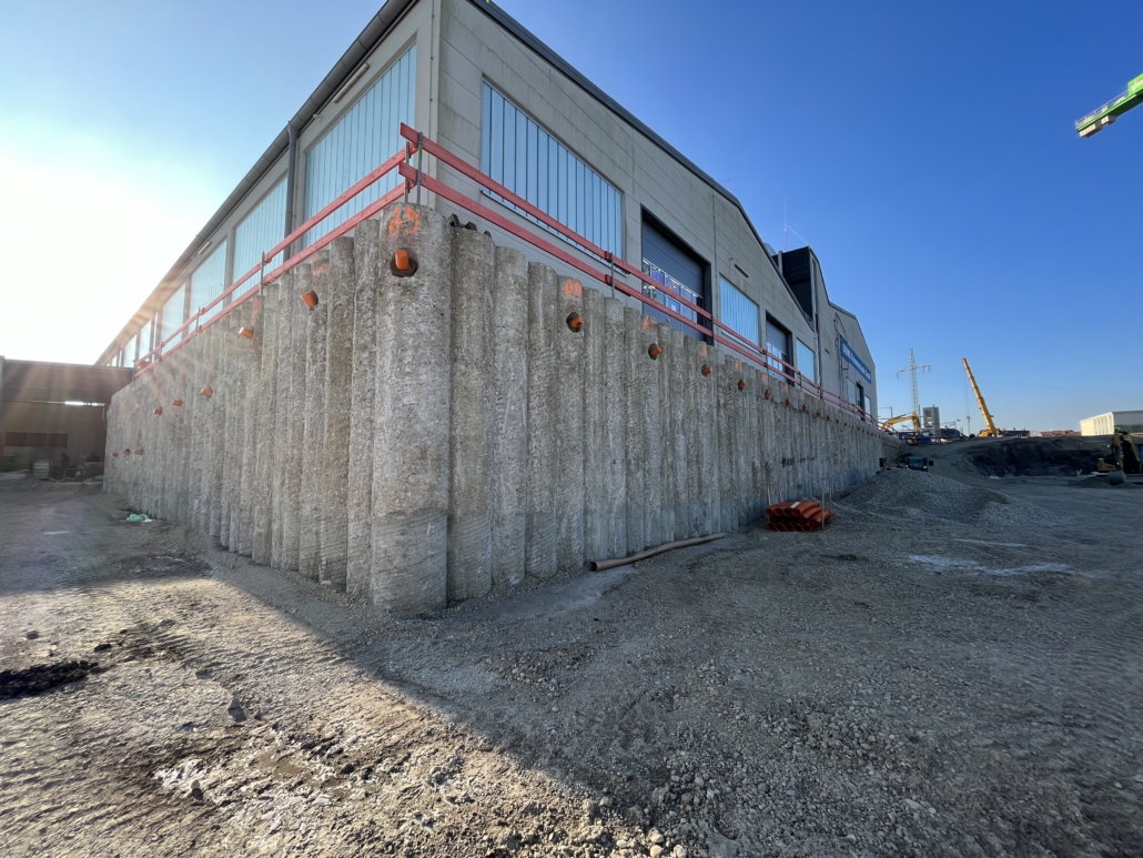 Hierbei wurde zur Absicherung des nicht unterkellerten Bestandsgebäudes eine Bohrpfahlwand mit Rückverankerung zur Baugrubensicherung auf eine Abwicklungslänge von etwa 135 Meter ausgeführt.