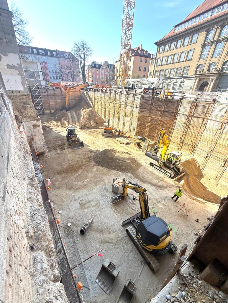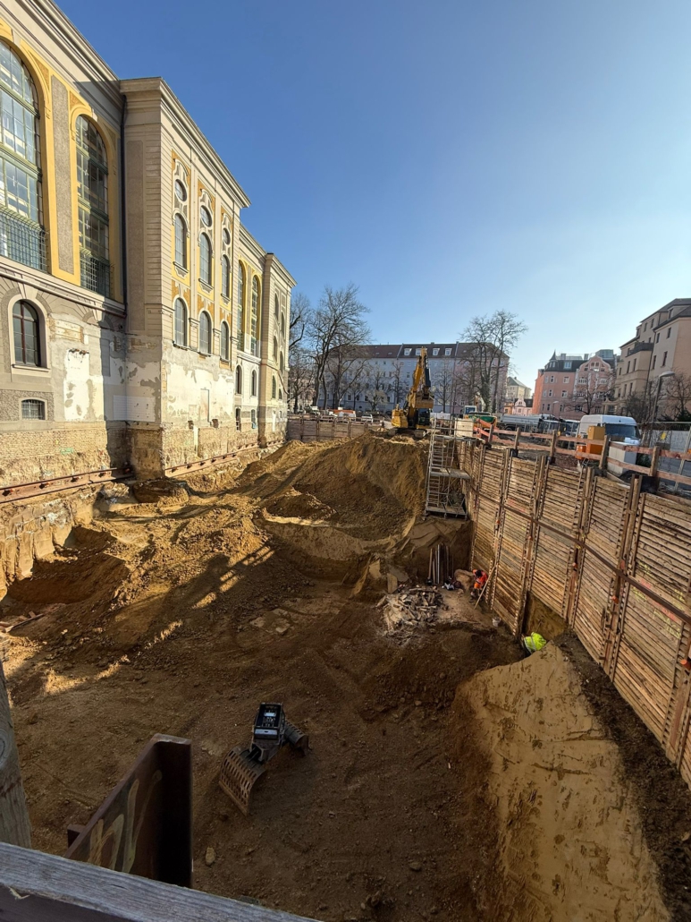 Hierbei wurden wir mit der Erstellung der Baugrube beauftragt. Neben der rückverankerten Trägerbohlwand wurde das denkmalgeschützte Gebäude mittels Hochdruckinjektion und Rückverankerung unterfangen.